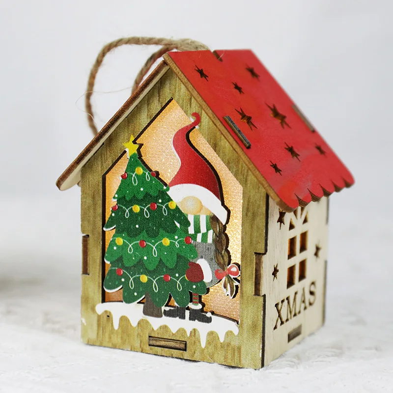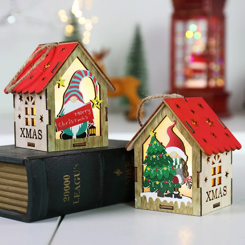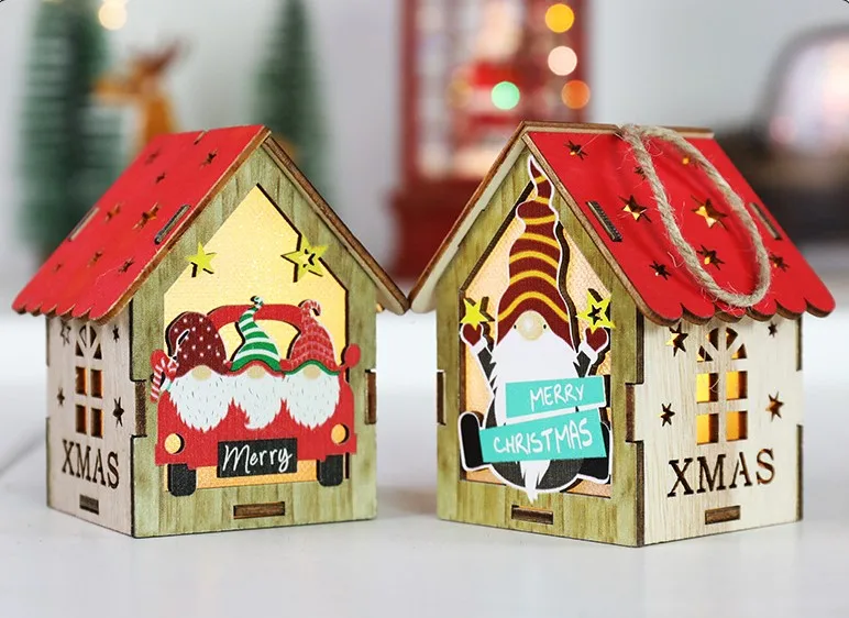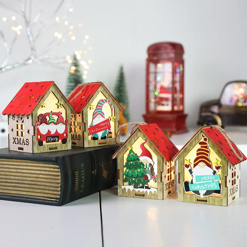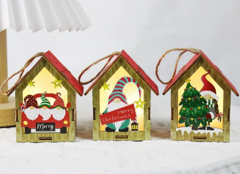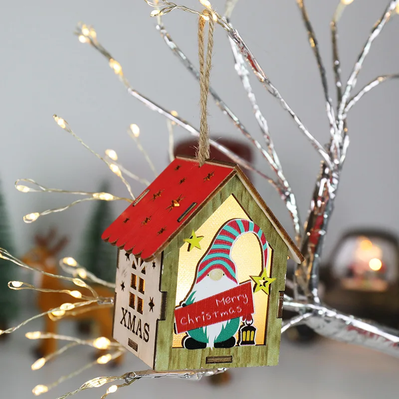 Christmas Tree Ornament Light Emitting Diode Yeti Colorful House with Candle Light Christmas Light Emitting Diode Wooden Gnome Doll Pendant