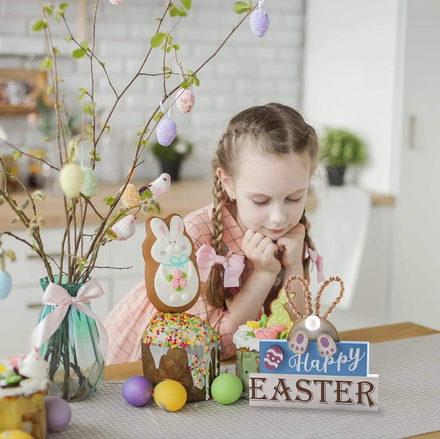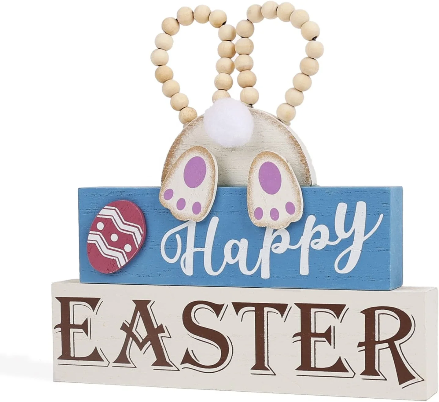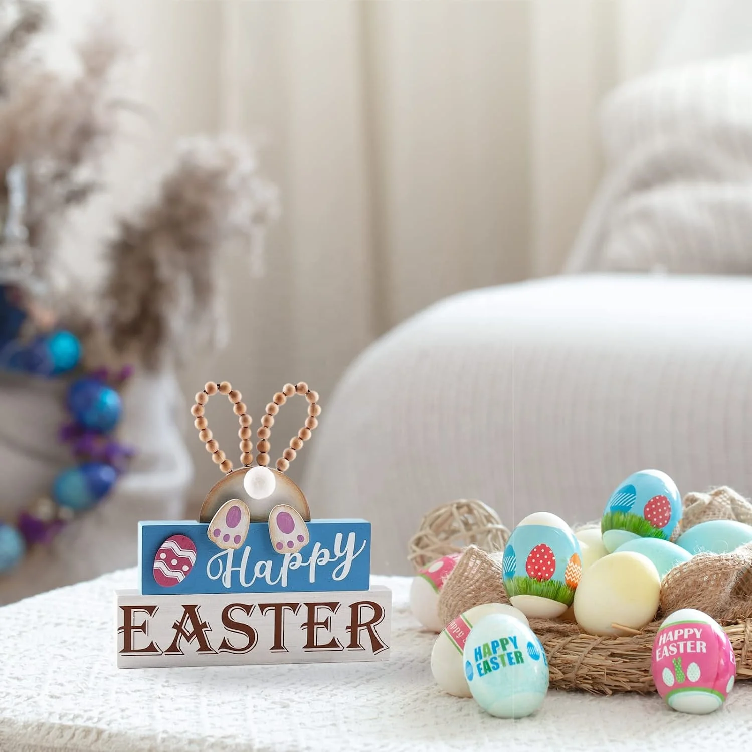 Easter and Thanksgiving 3 Decorations Home Country Spring Happy Easter Bunny Wood Signage Block Decorated with Layered Tray with Eggs and Wood Beads