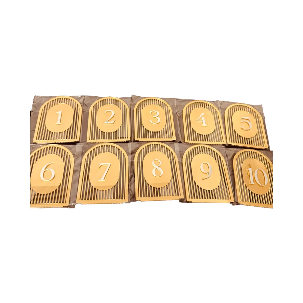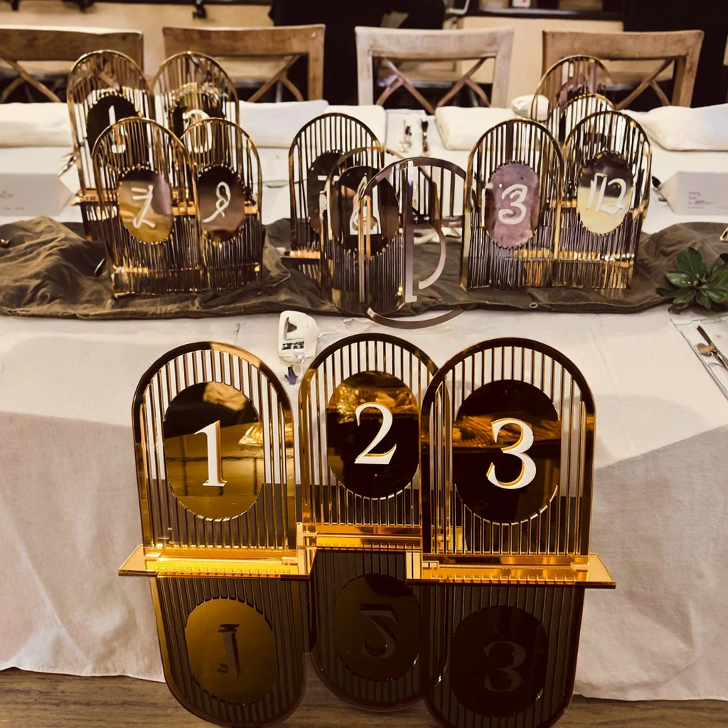 1 wedding party, elegant wedding table decorated with gold geometric mirror acrylic table numbers, with 3D font