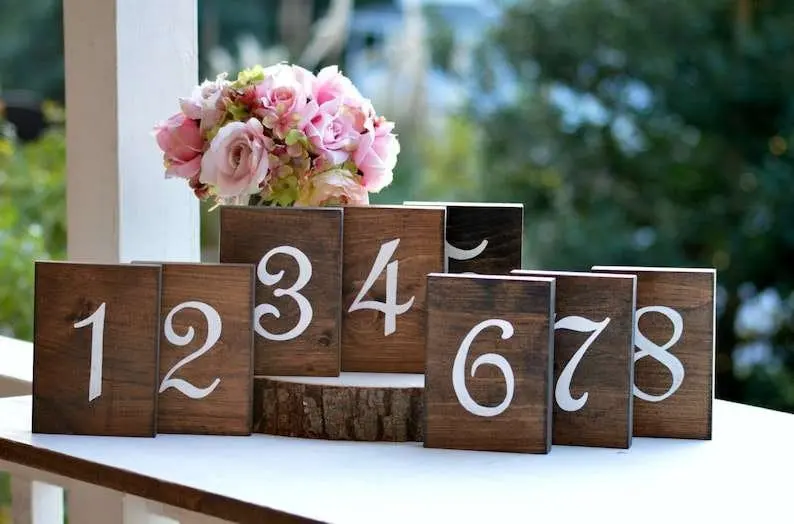 ESCRIPTION: These beautiful table numbers are stained with painted numbers. They complement any wedding decor from rustic to