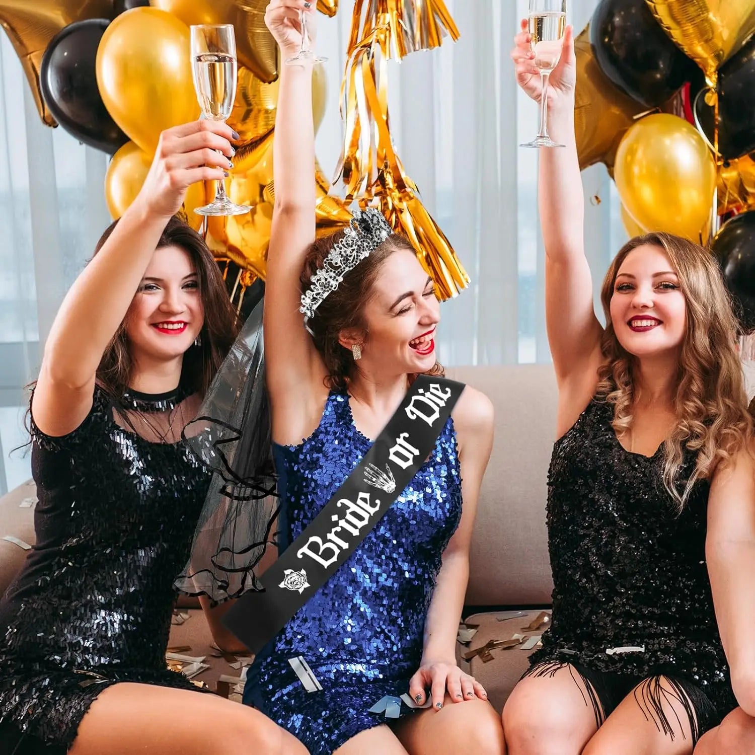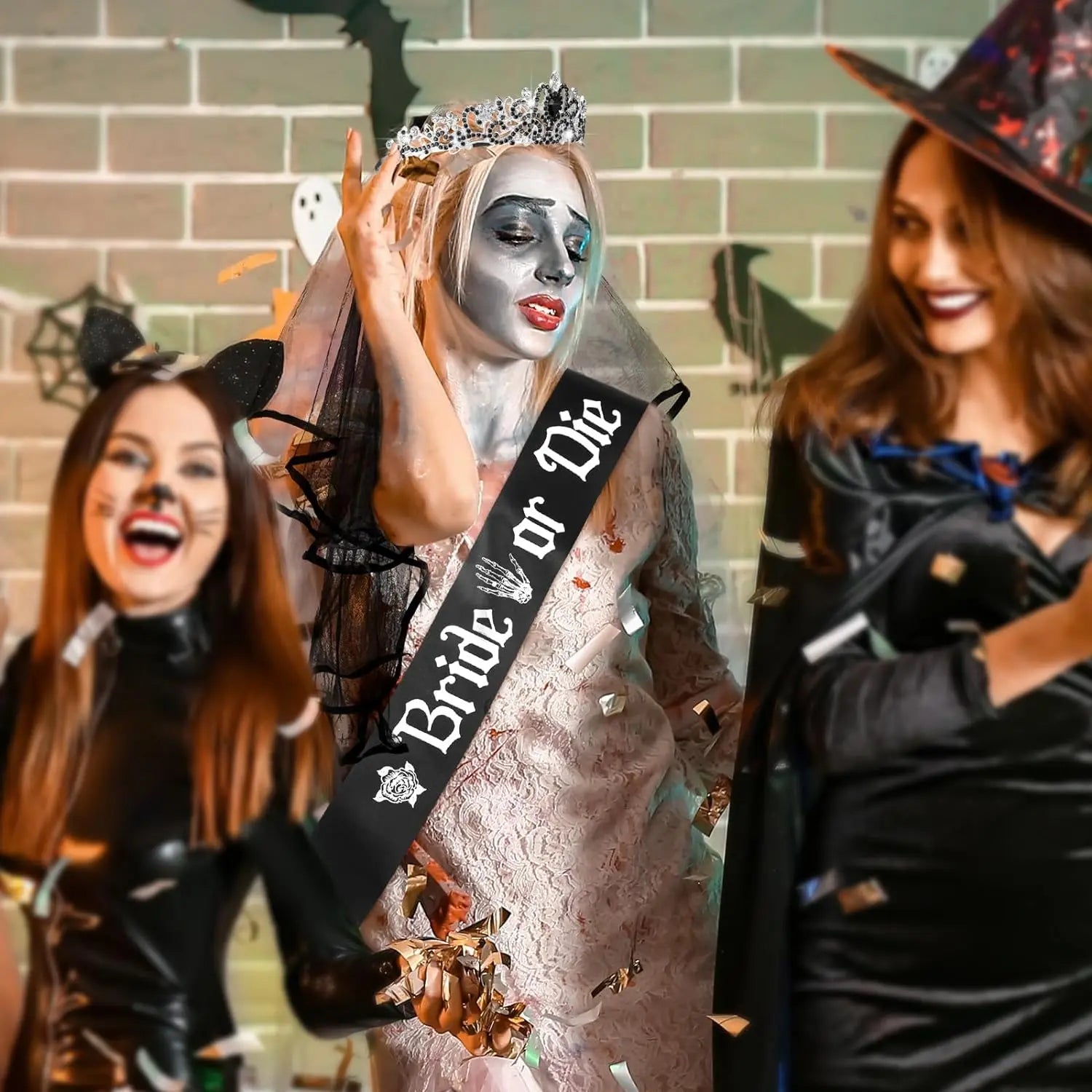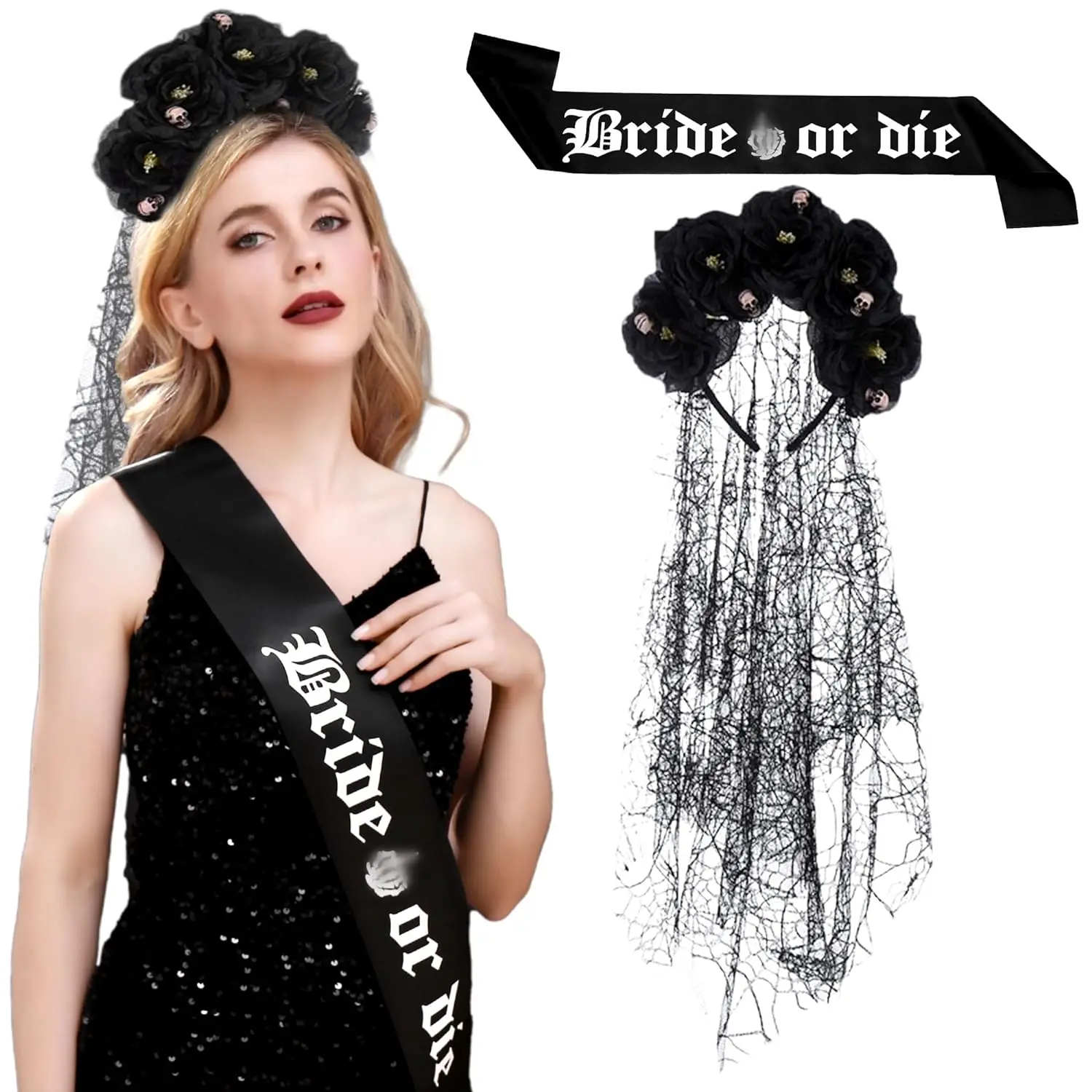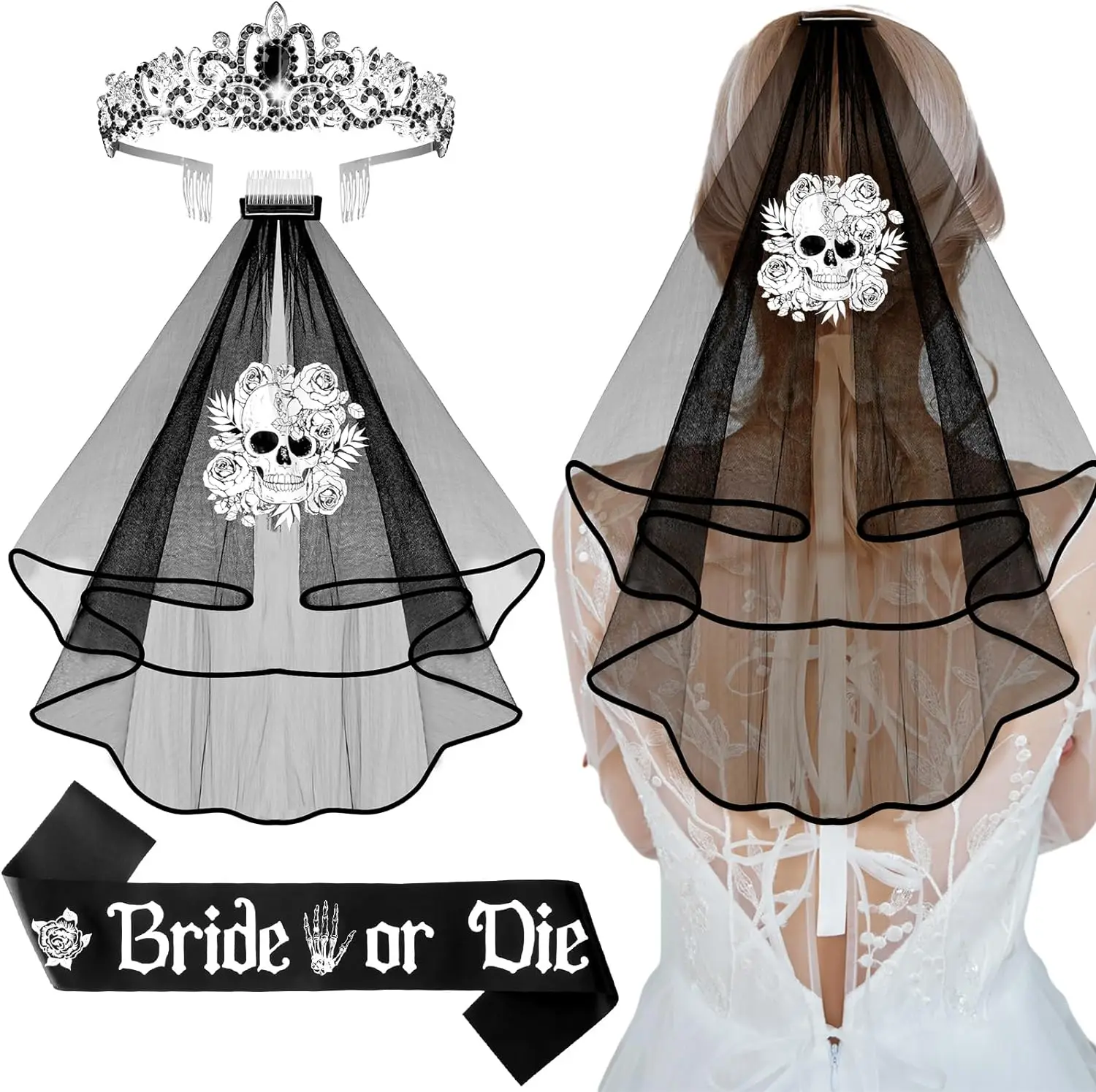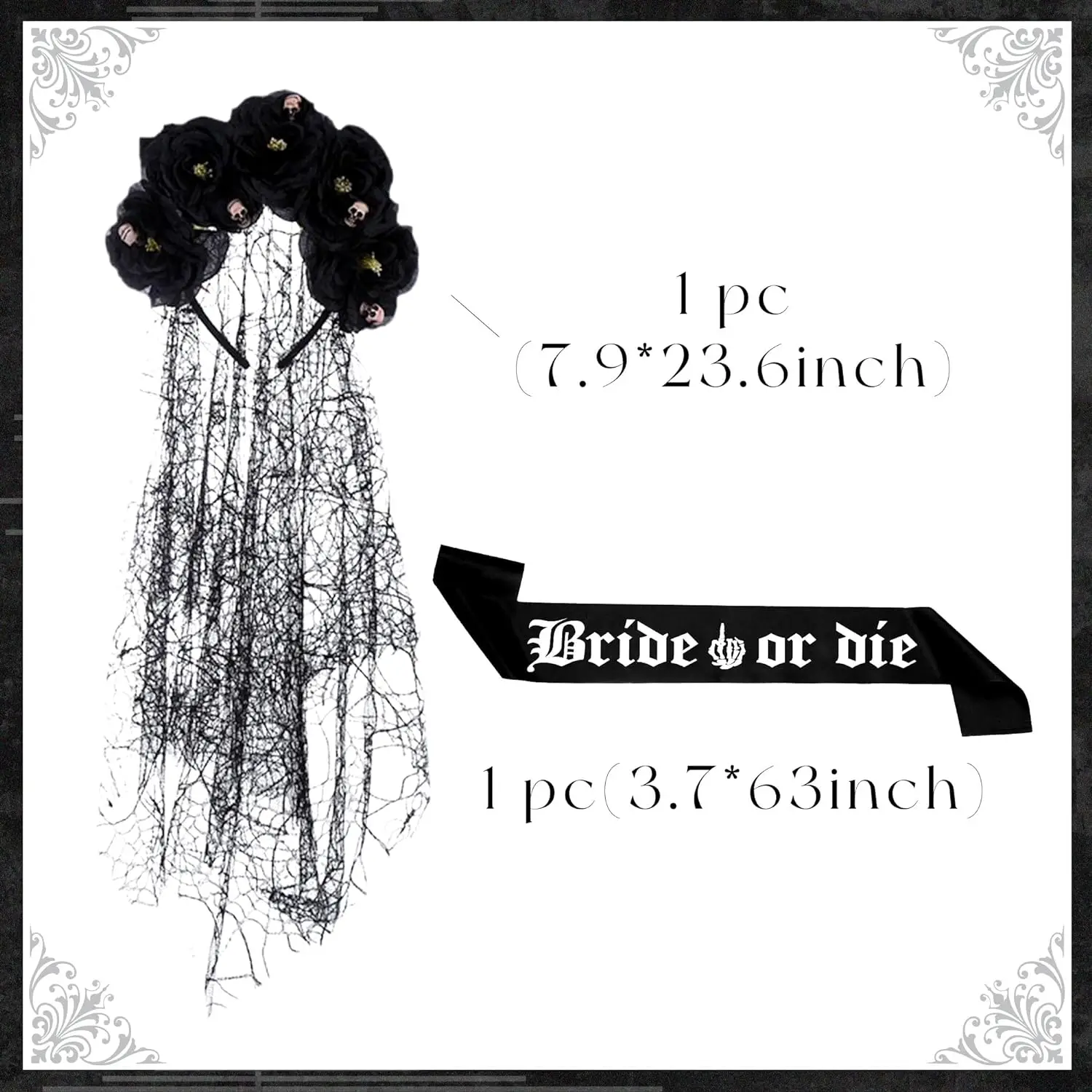Bachelorette Party 1 Pafu 3pcs Black Bridal or Death Veil Belt Bachelorette Party Ornaments Gothic Rose Headband Bridal Shower Crystal Crown
