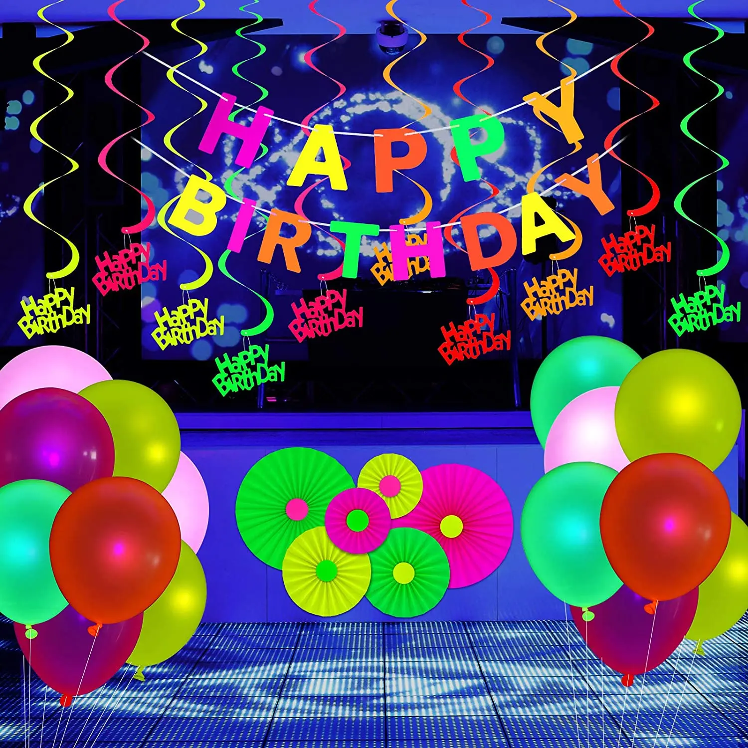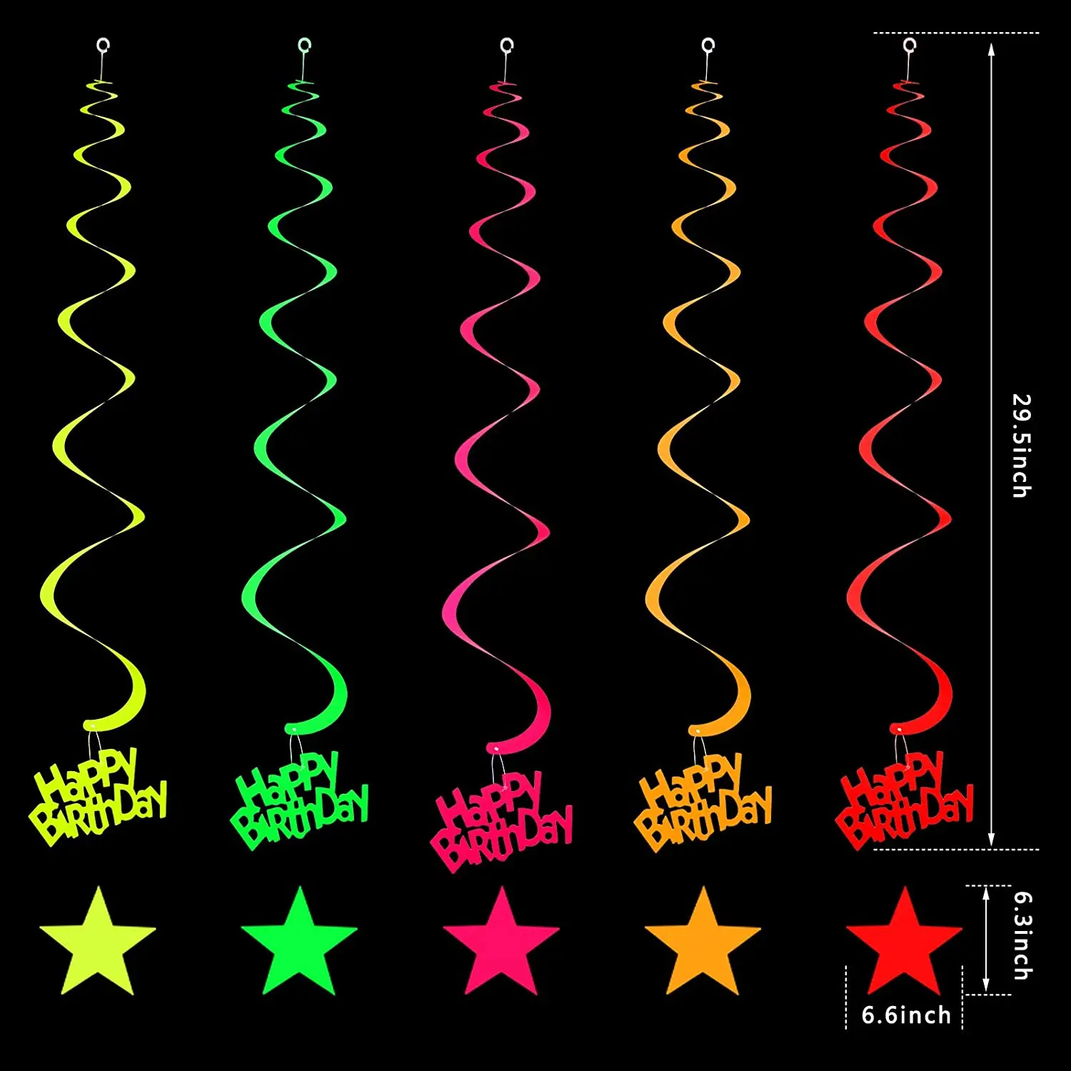 6 pcs of happy birthday hanging swirl decorations 15 neon fluorescent balloons in 5 colors 10 neon star cake toppers 1 yellow happy birthday cake toppers rich in quantity and types to prepare for an impressive glow neon party |