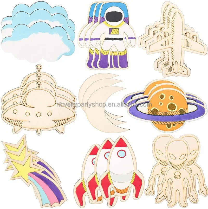 27pcs Unfinished Wooden Cutouts Wooden Paint Crafts Outer Space Party Favors Supplies Space Birthday Party Gift Bag Accessories
