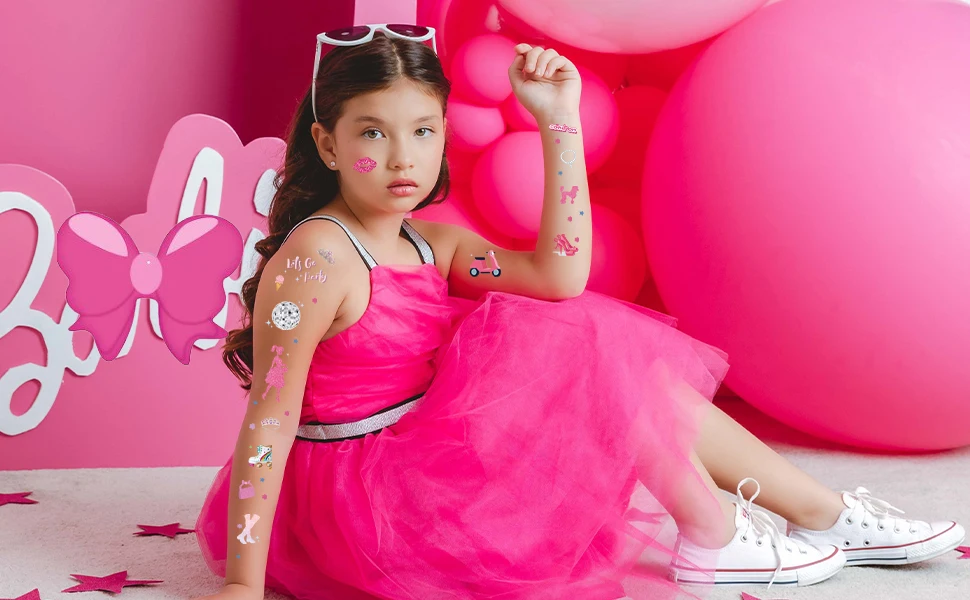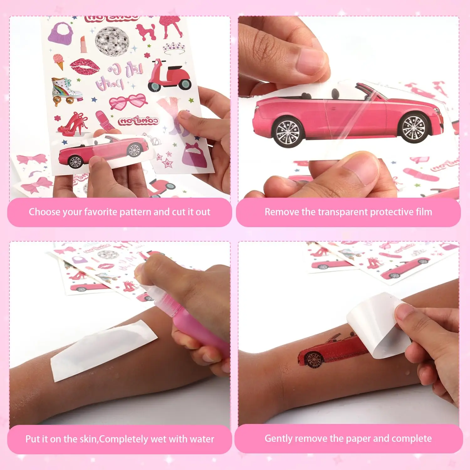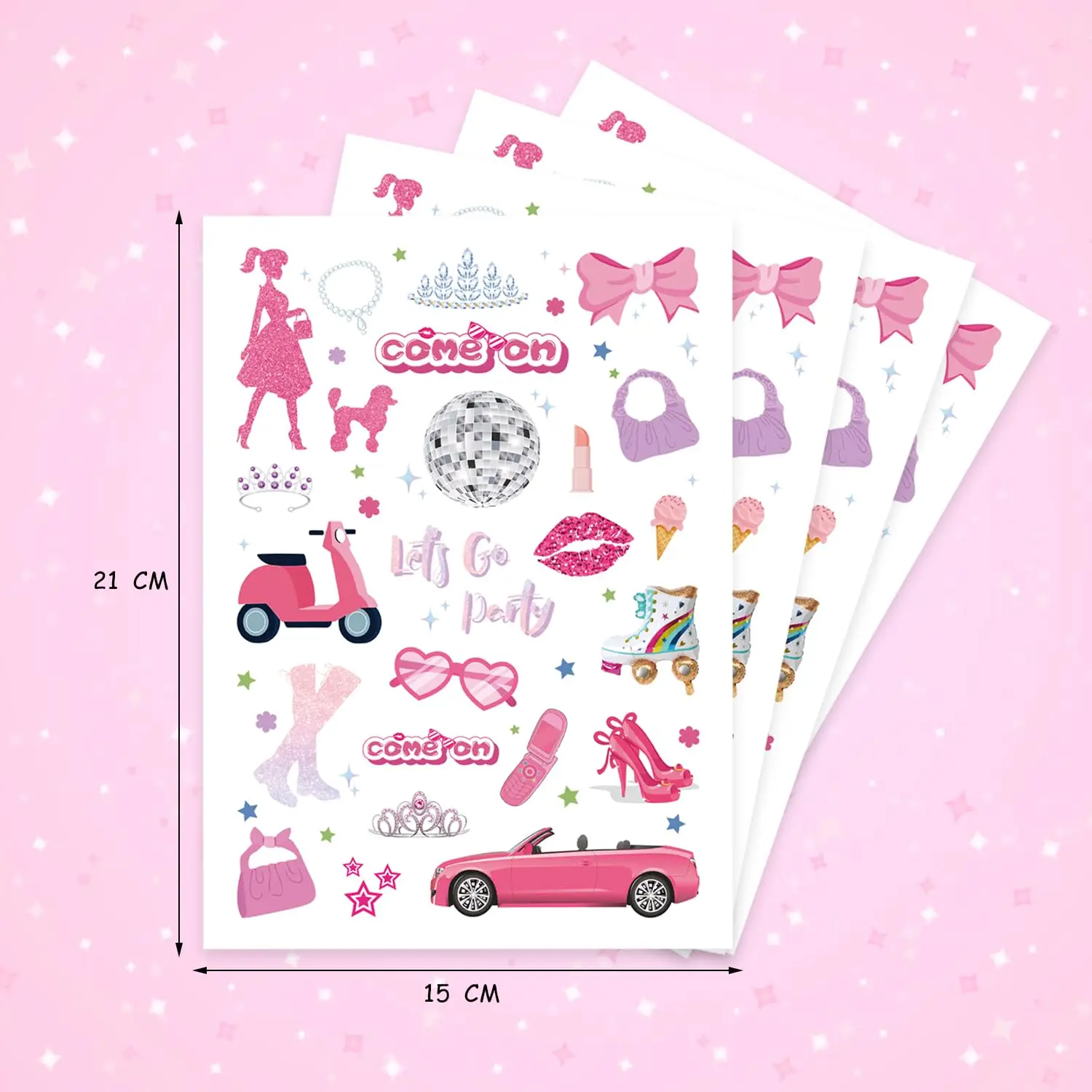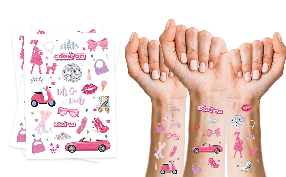 Birthday Party Pink Girl Temporary Tattoo-75, Pink Princess Baby Shower Birthday Party Decorative Paper Sticker Tattoo