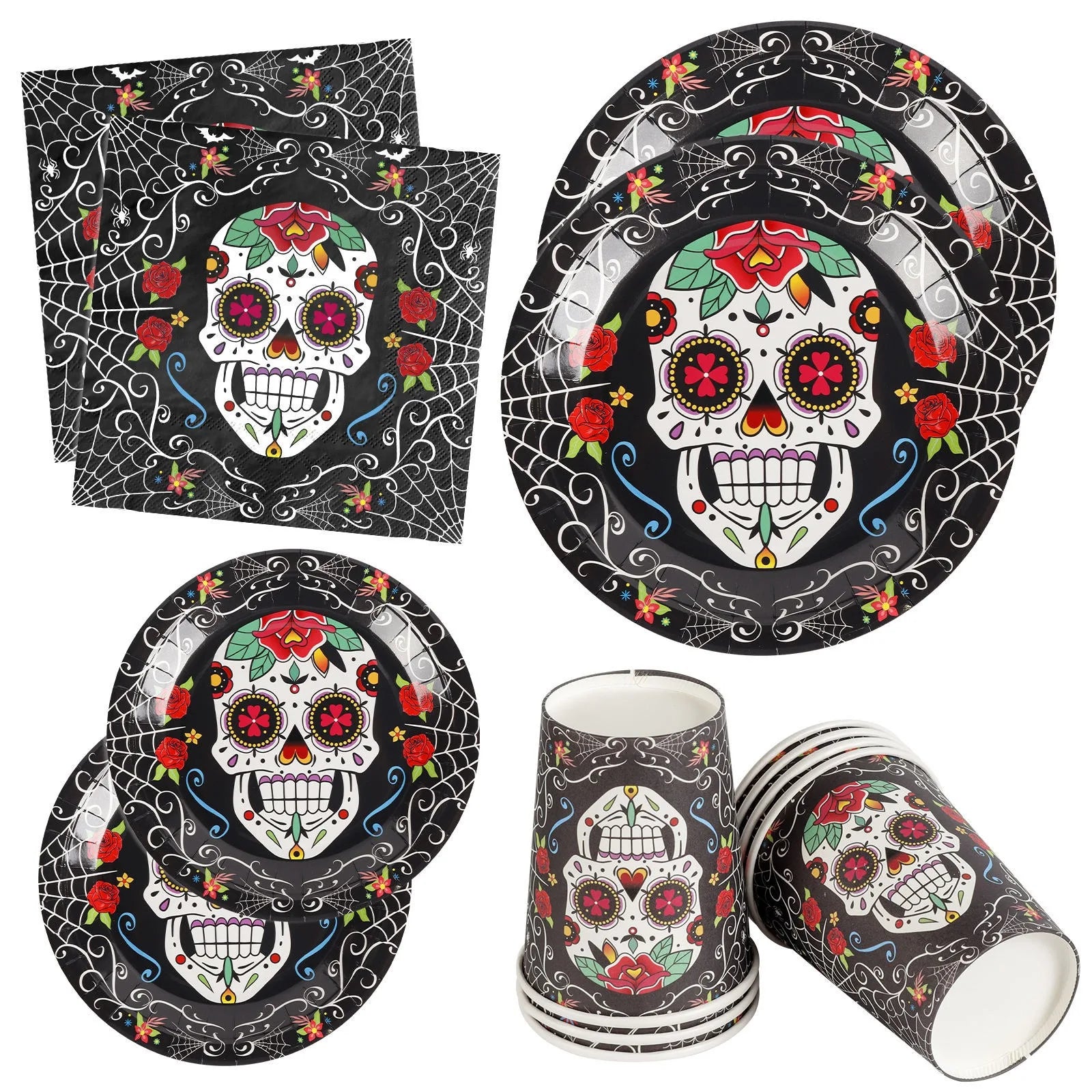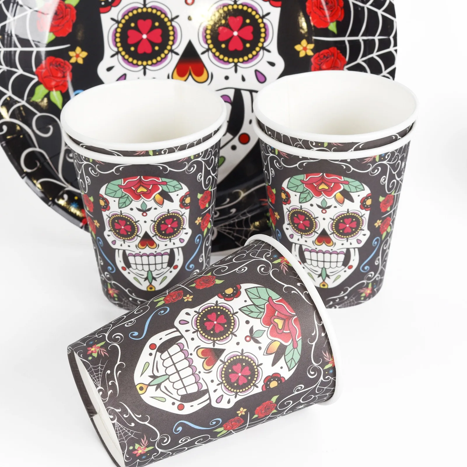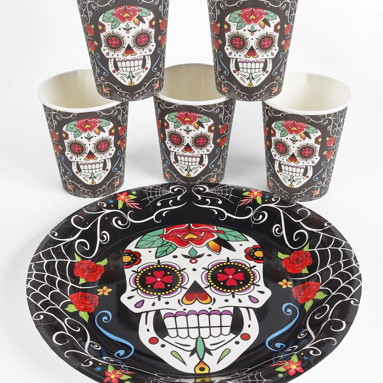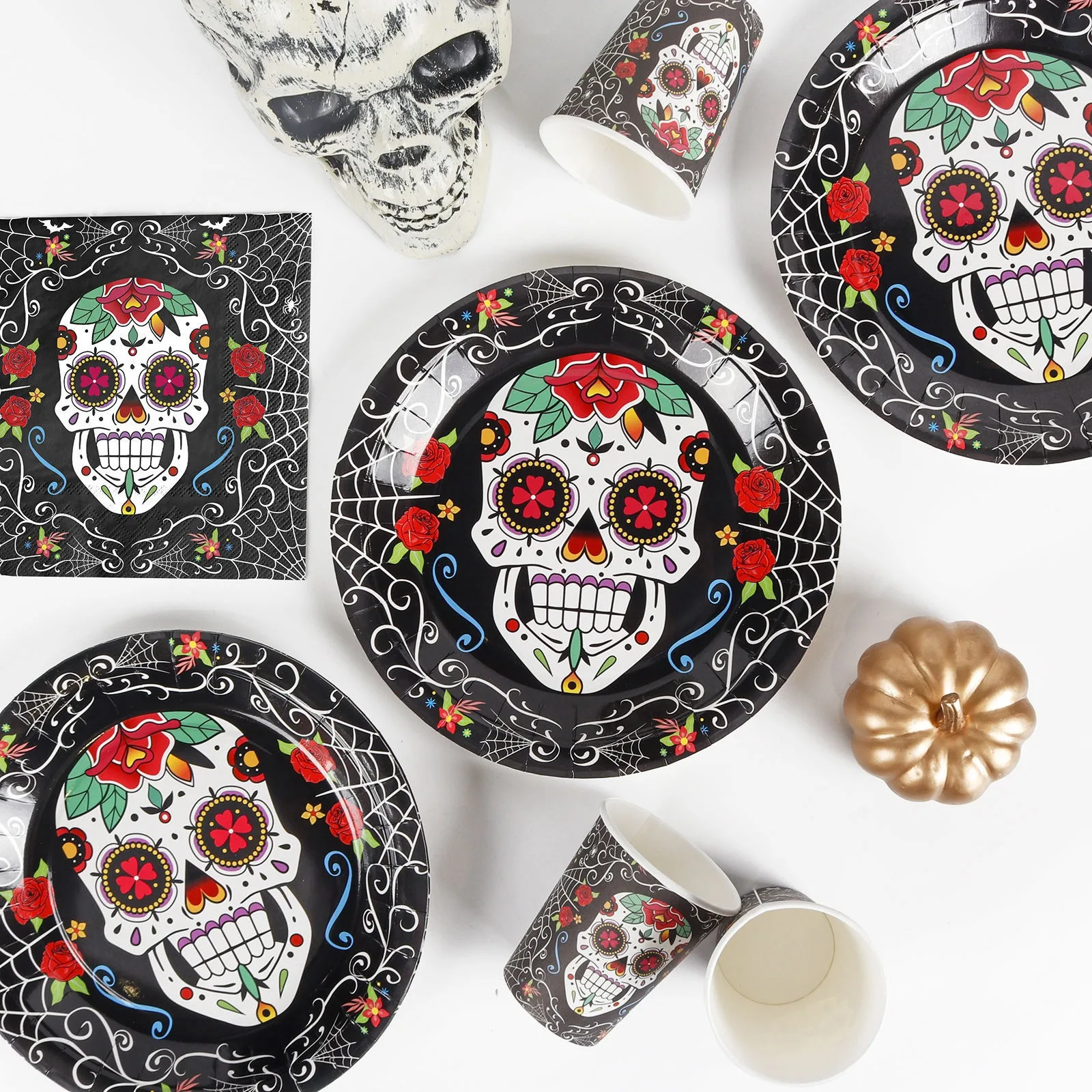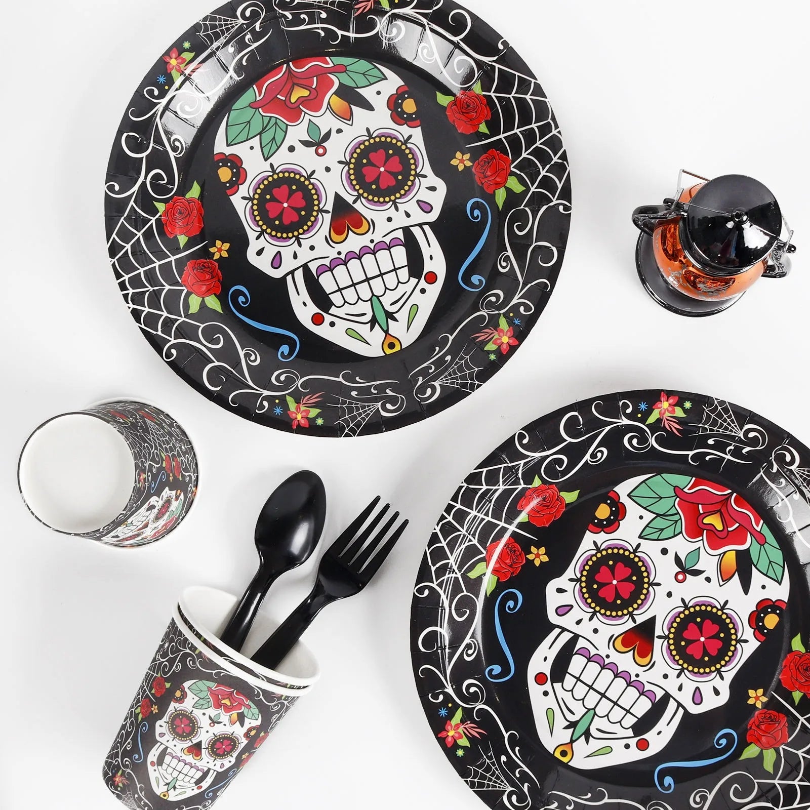 16 guests multicolor Day of the Dead sugar skull black charger set Carnival party supplies Halloween disposable tableware sets