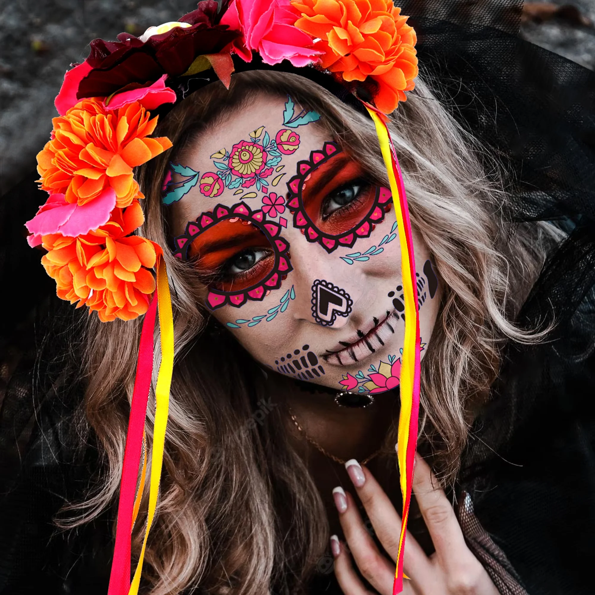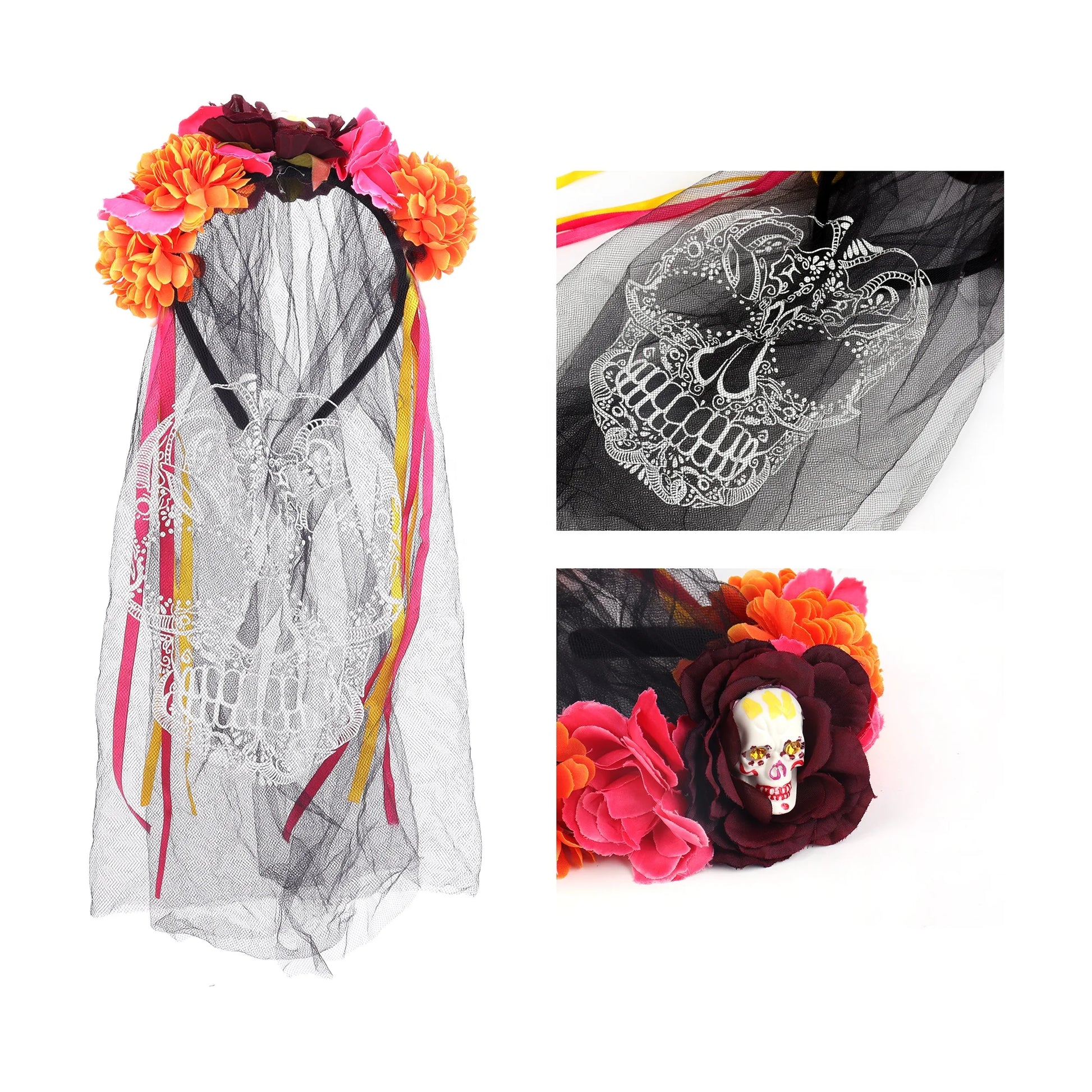 Halloween & Death Day Sugar Skull Neon Face Tattoo Women's Day Dead Flower Headband Halloween Costume Set