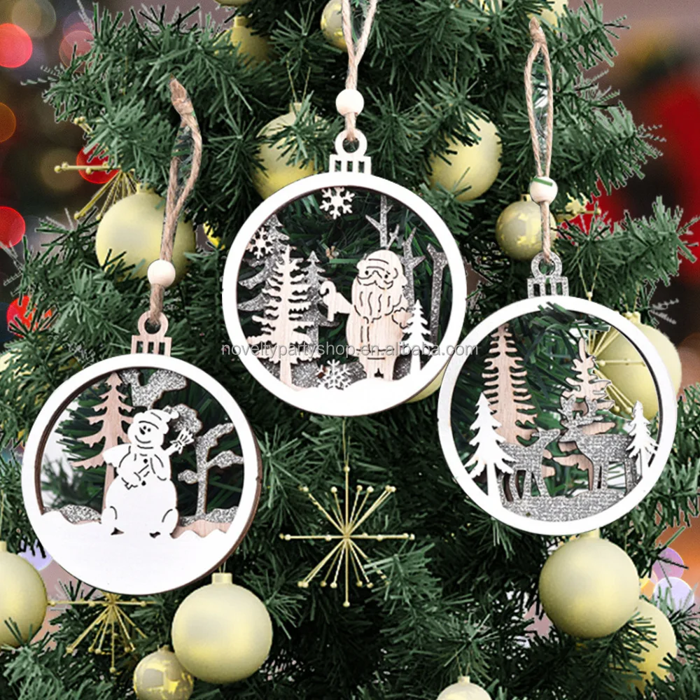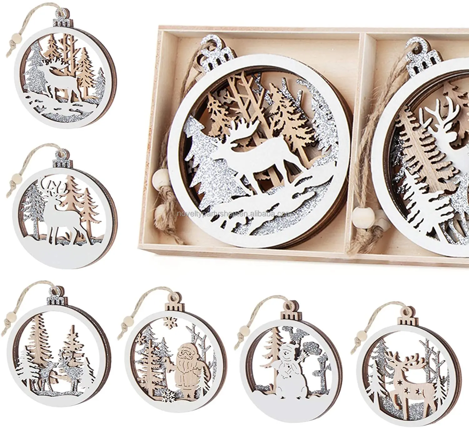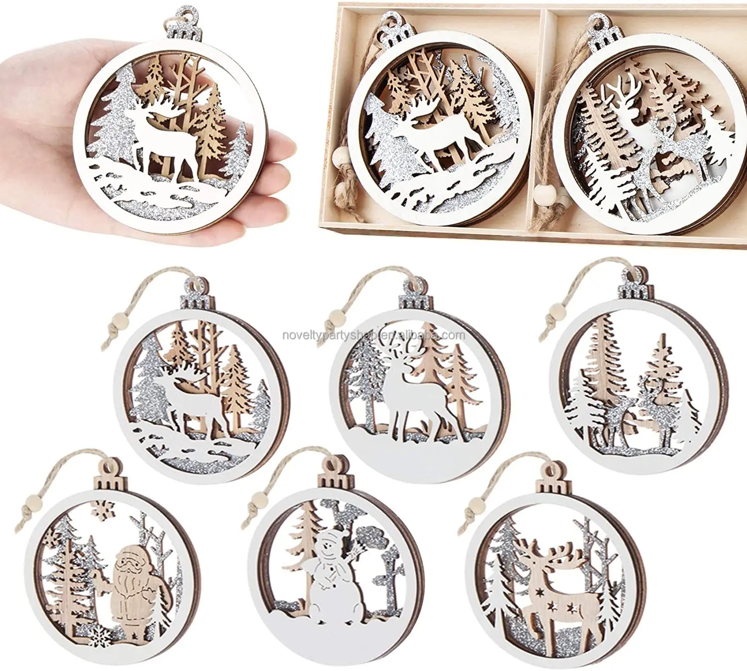 6pck Laser 3D Printing Christmas Hollowing Round Wooden Hanging Decoration Creative Santa Elk Snowman Christmas Tree Wooden Pendants
