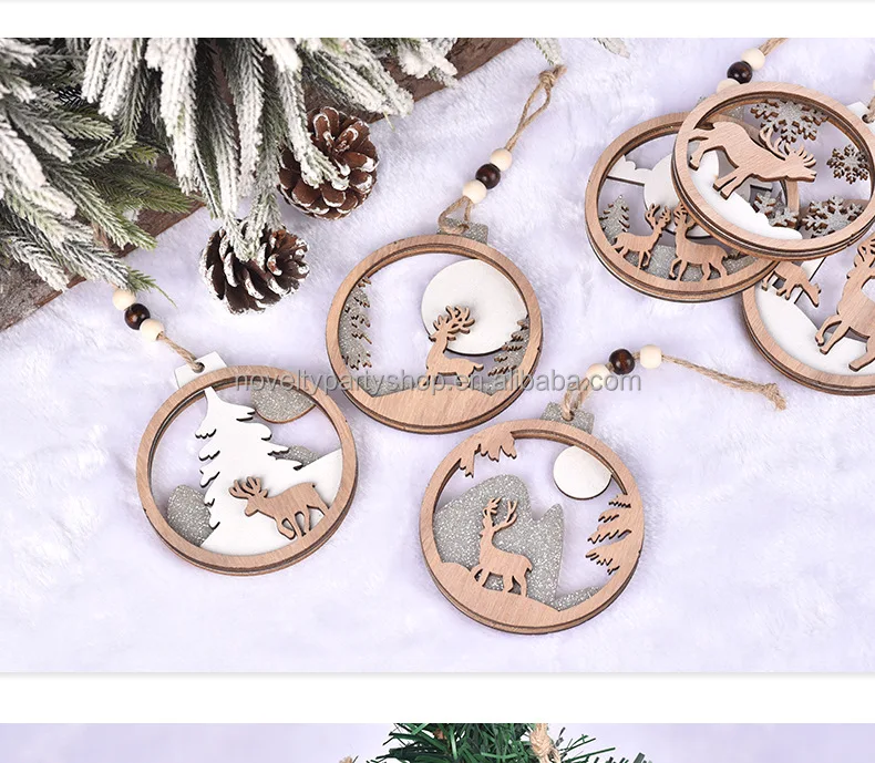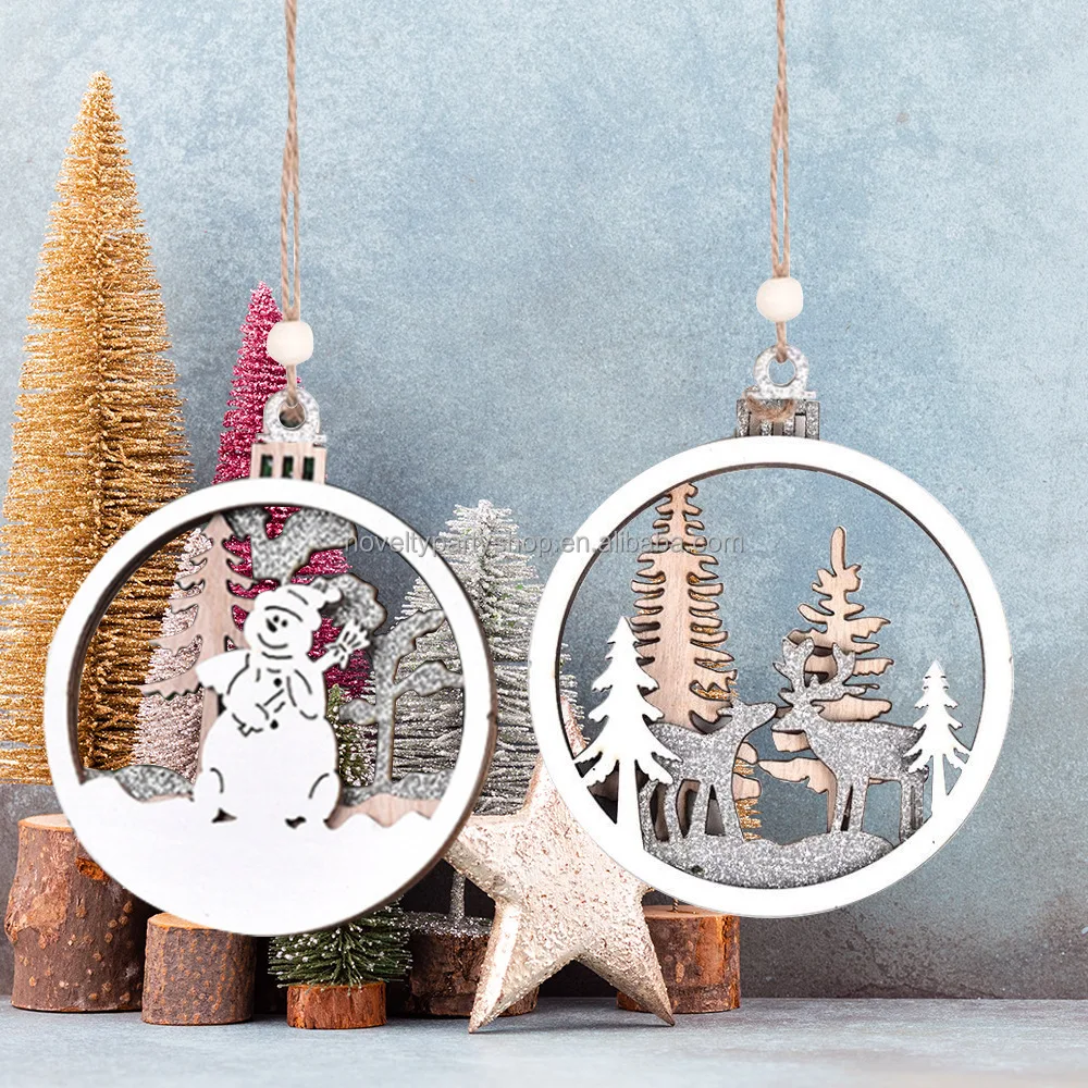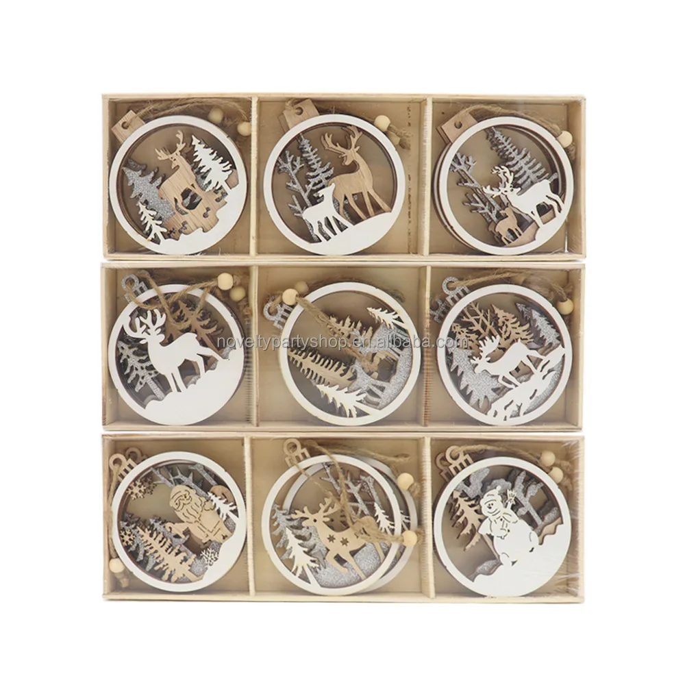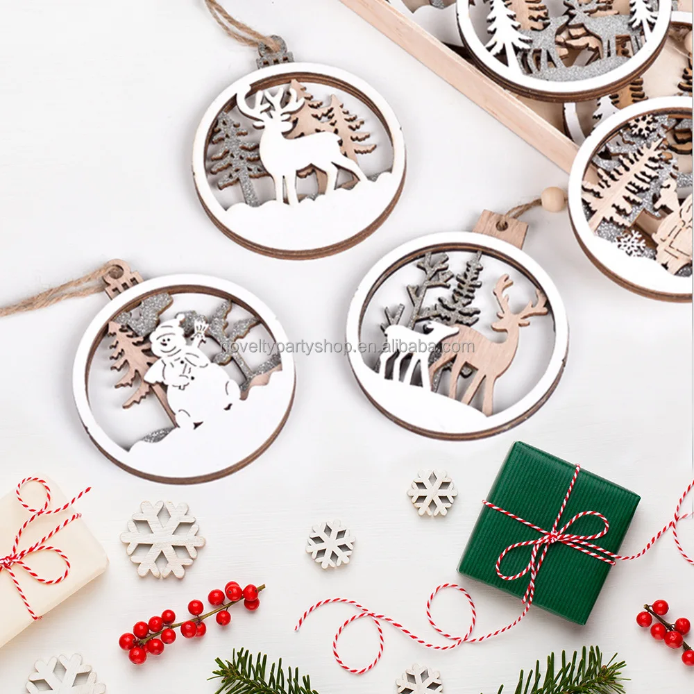 6pck Laser 3D Printing Christmas Hollowing Round Wooden Hanging Decoration Creative Santa Elk Snowman Christmas Tree Wooden Pendants