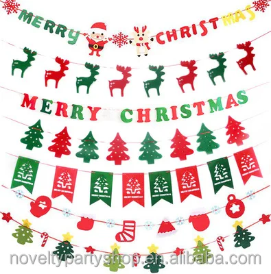 piece of 20*20 cm, weighing about 50 grams, length 2.5 meters, adjustable Christmas tree pull flag: a single piece of 15*20 cm,weighs about 37 grams, length 2.5 meters, adjustable Christmas deer pulls the flag: a single piece of 20*13 cm, weighs about 29grams, 2.5 meters in length, adjustable Christmas stocking flag: a single piece of 20*14 cm, weighs about 45g, length 2.5 meters,adjustable |