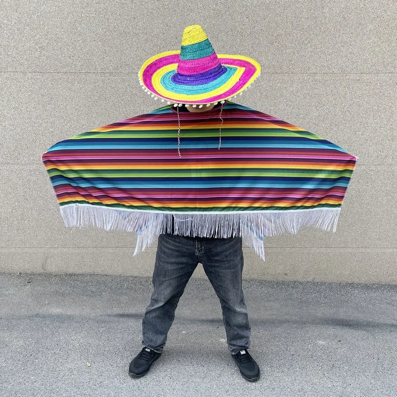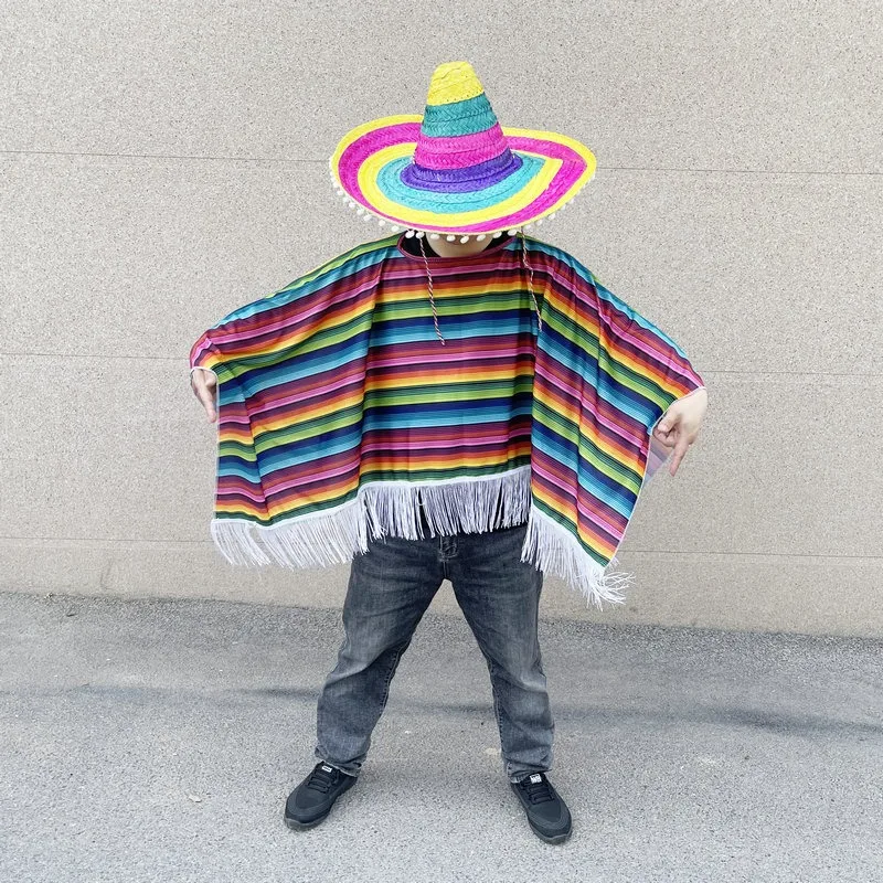 Mexican Party Dress Adult Wear Rainbow Striped Poncho Hat Cosplay Halloween Costume with Serape Cape Mexican Ornaments