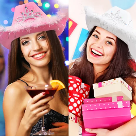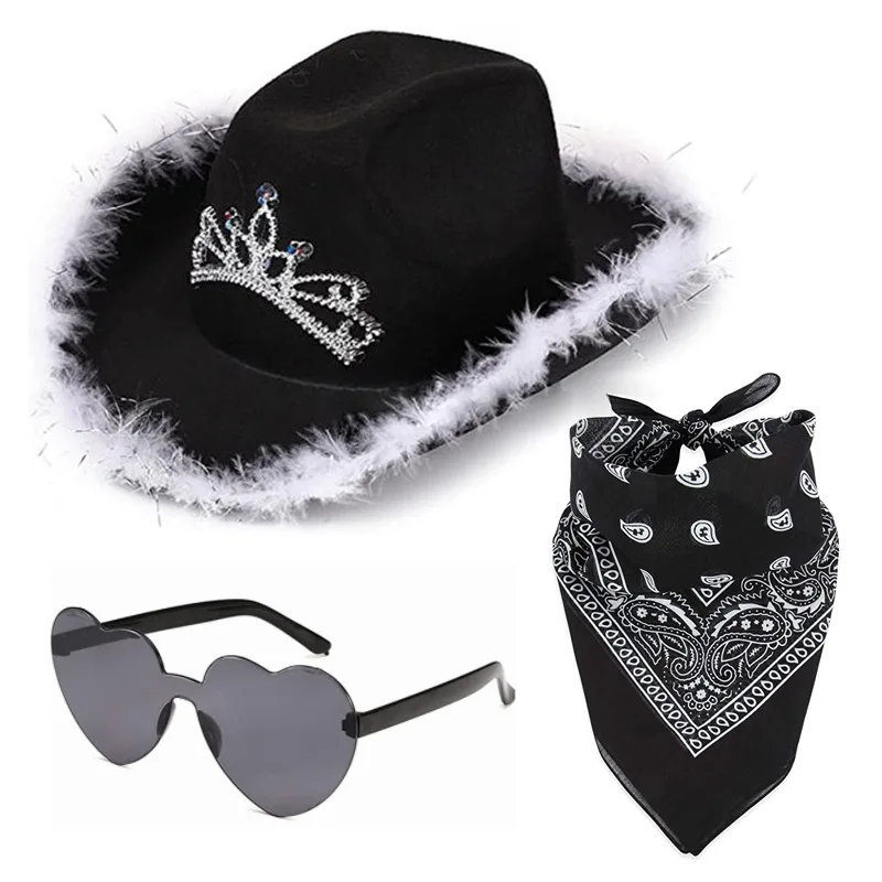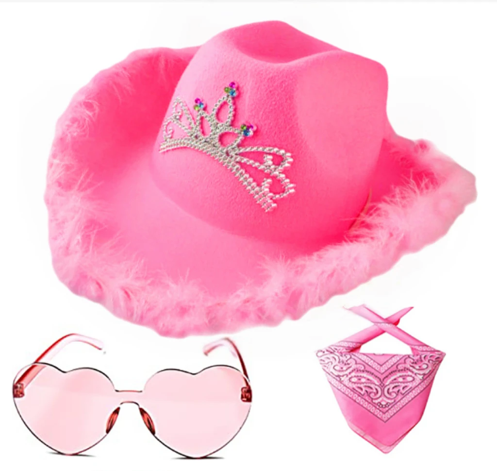 Wholesale 3Pcs Hot Pink Halloween Costume Set Pink Felt Cowboy Hat with Tiara and Feathers Bandana Sunglasses
