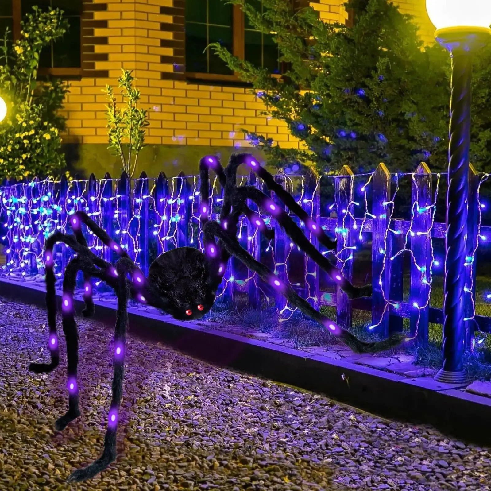 Aranha gigante iluminada de Halloween de 60 cm, decoração realista para festa de quintal, casa, LED, aranhas peludas pretas de Halloween